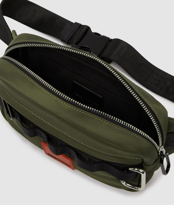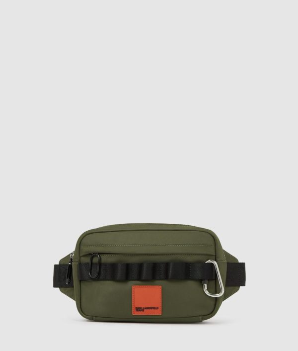 Add edge to any look with this belt bag, accented by a utilitarian webbing detail with loops and a carabiner clip. The versatile strap offers wear at the waist or across the body, while the piece is anchored by a KARL LAGERFELD JEANS box logo.