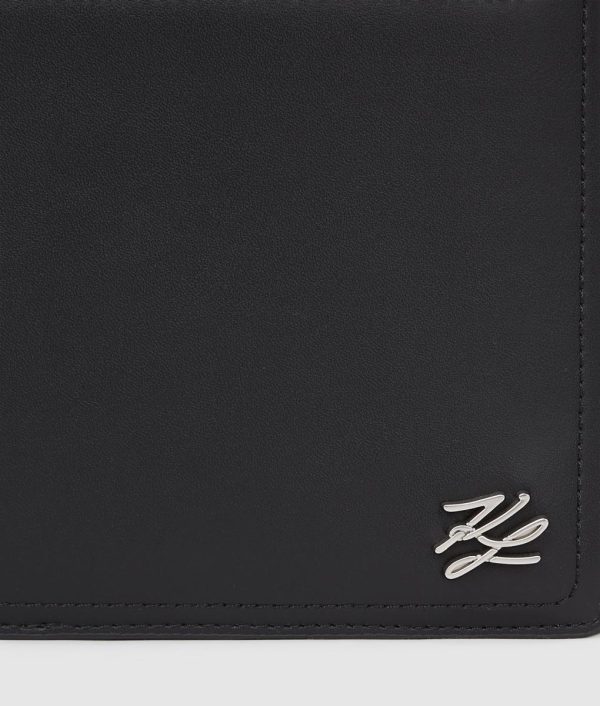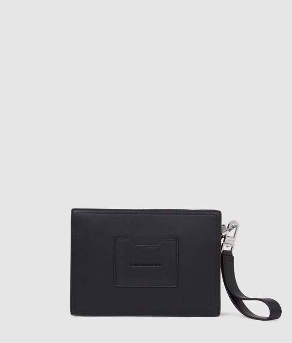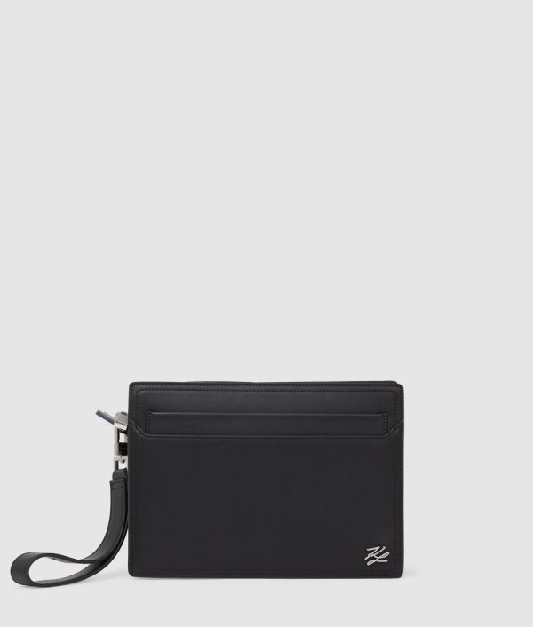 This contemporary pouch features a zip closure and detachable wrist strap, perfect for when you’re on the go. A front pocket enhances practicality, while minimalist Karl Autograph hardware adds a signature touch.