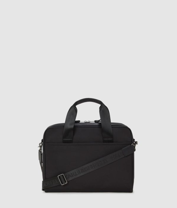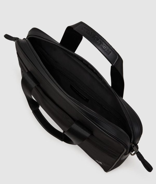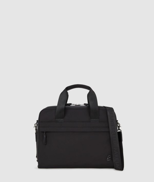 Elevate your professional wardrobe with this briefcase featuring a secure zip closure, front pocket, and twin handles with a detachable strap for easy carrying. Accented with the Karl Kameo motif, it marries style with functionality.