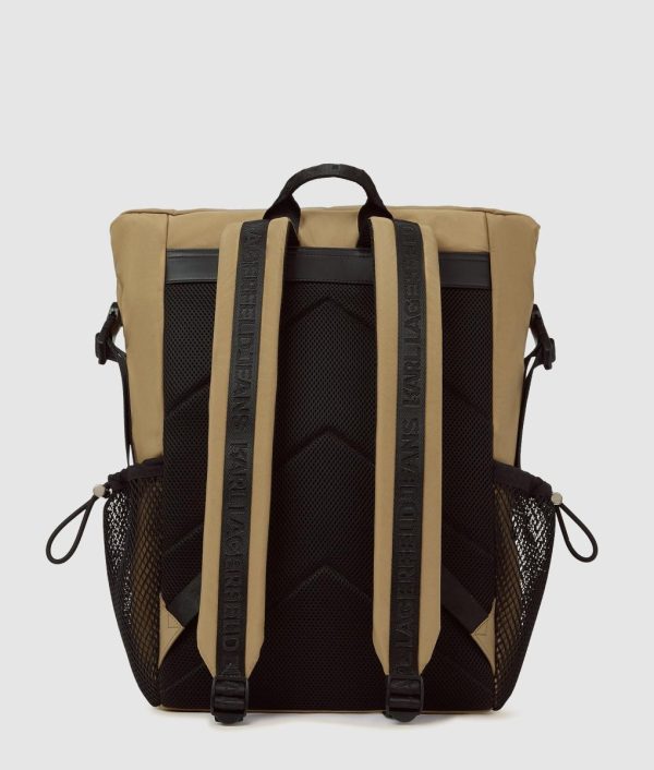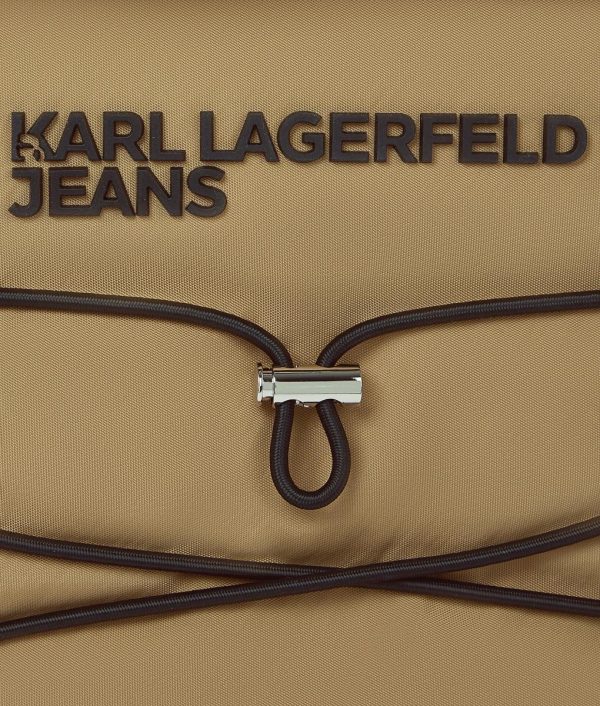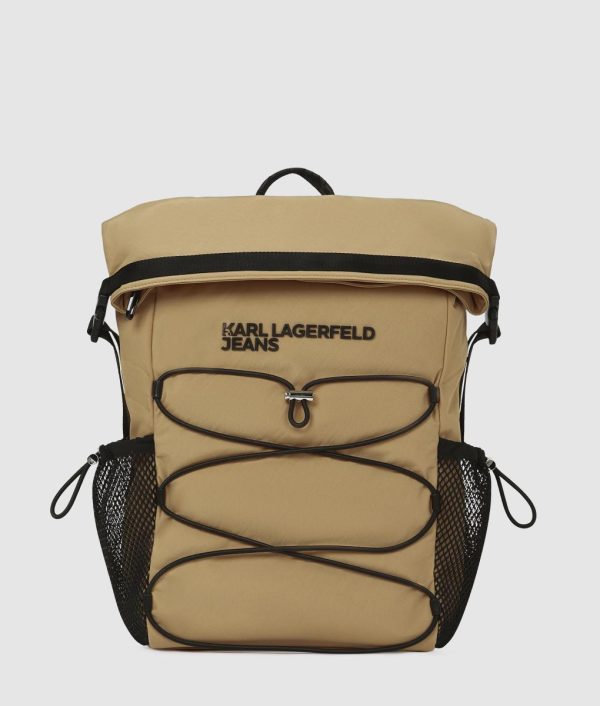 A utility-inspired backpack, featuring a roll-top closure with a secure zip and contemporary buckle accents. Mesh pockets and edgy drawstring detailing add an adventurous flair, complemented by the KARL LAGERFELD JEANS logo.