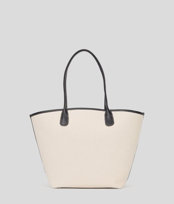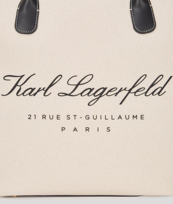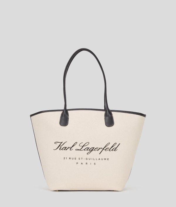 This medium canvas tote bag brings new levels of refinement to your vacation wardrobe. Structured twin handles and contrast binding offer a classic, vintage look, enhanced by chic Hotel KARL artwork. An inside drawstring pouch ensures essentials are safely stored, offering a luxurious bag that blends elegance with functionality.