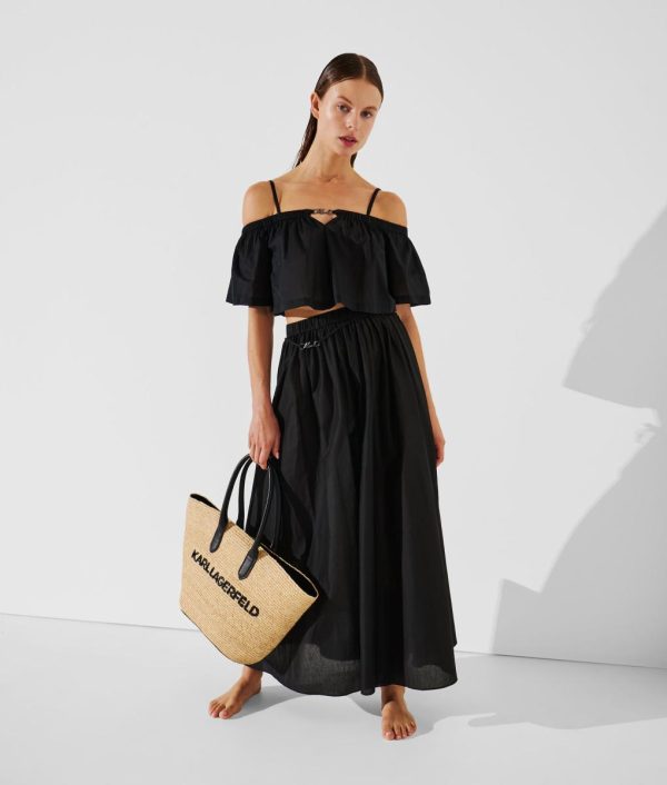A must-have for sun-soaked days, this stunning maxi skirt features a flowing silhouette and comfortable elasticated waistband adorned with the KARL SIGNATURE charm. Perfect for pairing with a matching off-shoulder top, it embodies laid-back elegance for beachside strolls.