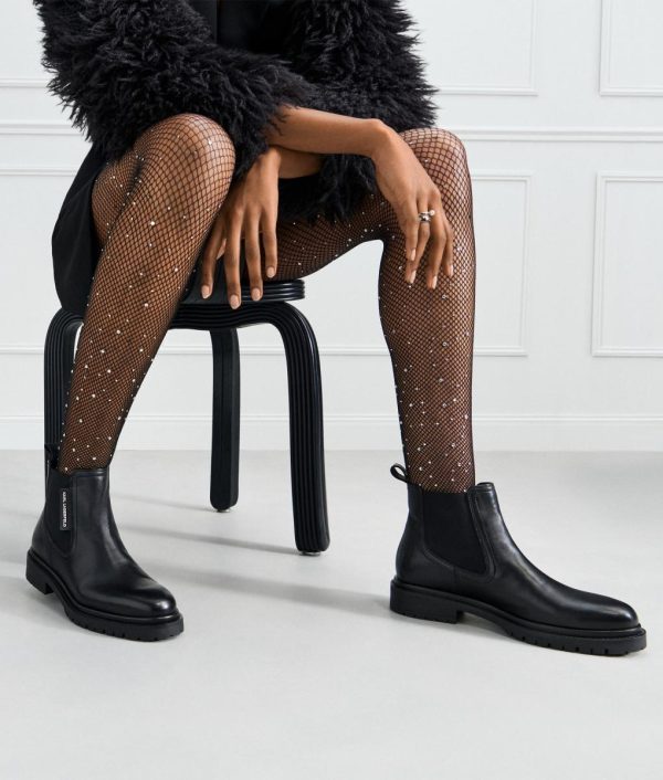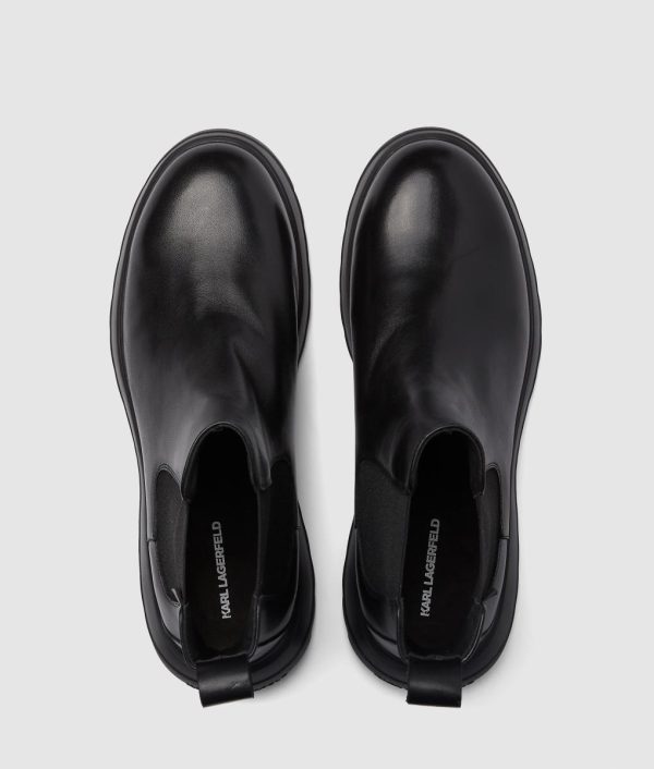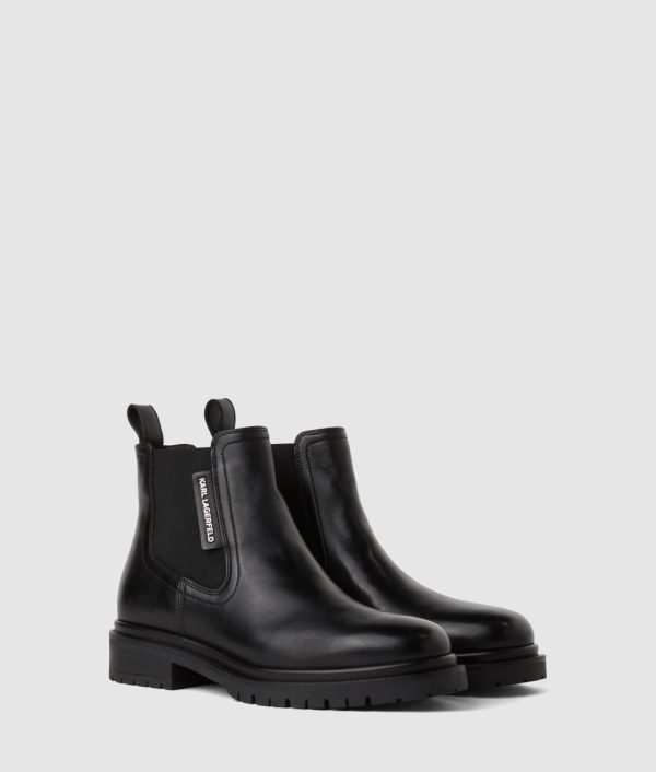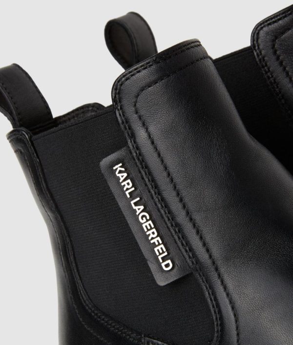 Crafted from leather with a polished finish, these classic ankle boots add a touch of timeless style to any look. An elasticated gusset and low block heel ensure easy wear, accented by a subtle KARL LAGERFELD logo tab.
