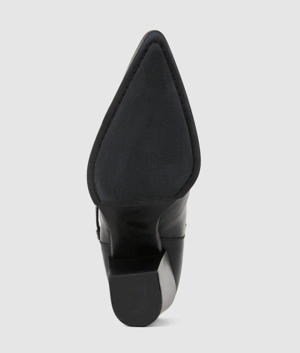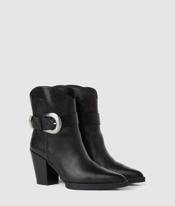 A Western-inspired buckle takes center stage in these playful boots. The platform heel offers comfort, while the sophisticated pointed toe adds a refined touch, perfect for taking looks from day to night.