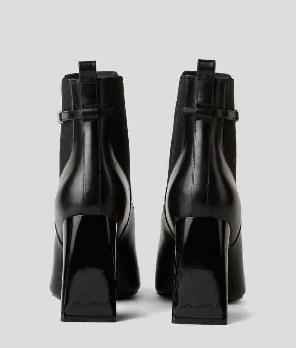 Elevate your year-round footwear lineup with these sleek ankle boots, boasting a slip-on style for ease and a molded platform heel. Elasticated gussets ensure a snug fit, while the KARL Signature metal charm adds a touch of luxury.