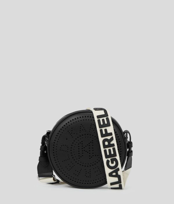 Crafted in a statement circular silhouette and enriched with a contrasting KARL-branded webbing strap, this smooth leather crossbody bag is a statement addition to any look. Embossed artwork at the front, featuring the KL House monogram encircled by the iconic KARL logo, completes the standout piece.