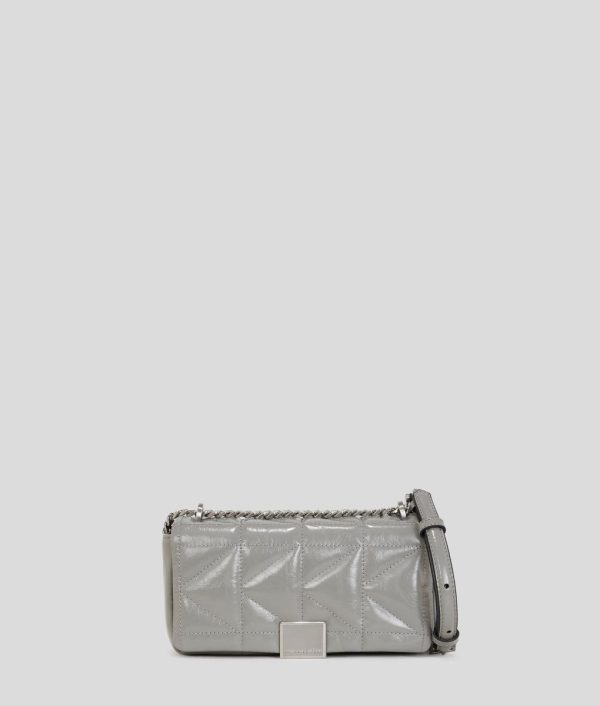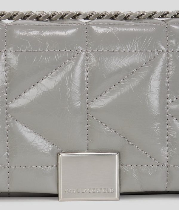 This small crossbody bag showcases a high-shine quilted design, merging elegance with practicality. A secure push-lock closure and a rock-chic leather and chain strap elevate everyday looks, while a KARL LAGERFELD plaque adds a touch of luxury. Embellished with quilted details and plush texture, the trademark ‘K’ stitching adds a unique dimension to this modern classic