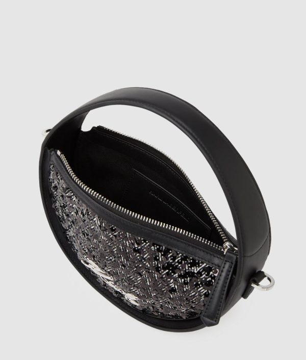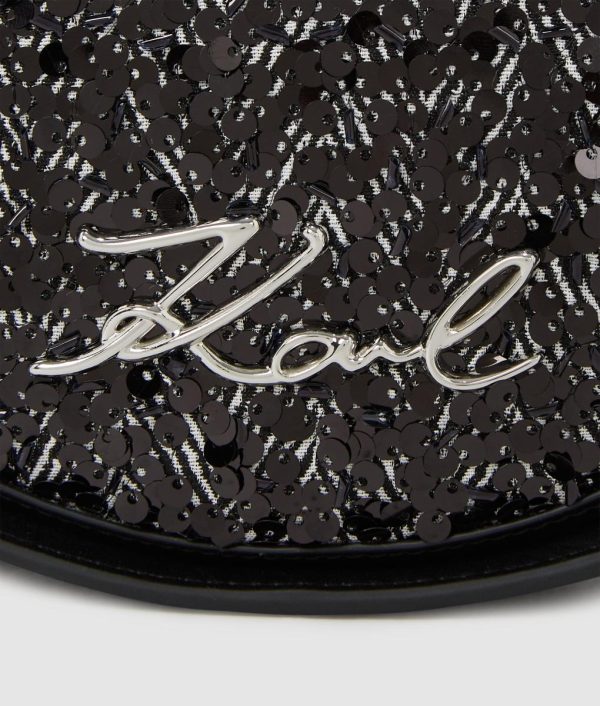 Timeless elegance meets contemporary style in this crossbody bag embellished with all-over sequins and sleek Karl Signature hardware. A circular top handle and adjustable strap offer versatile styling for any evening outfit.
