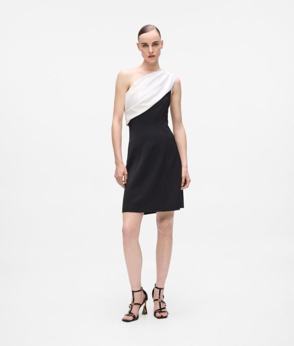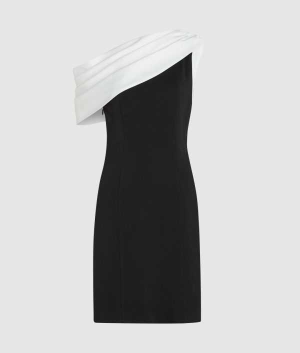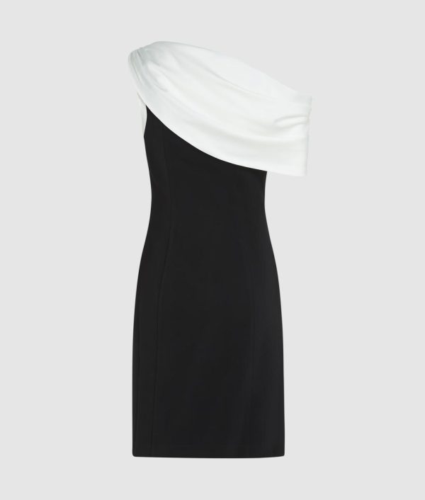 Chic, sculptural, and unforgettable. This monochrome midi dress is defined by a gathered satin panel that sweeps across the asymmetric neckline.