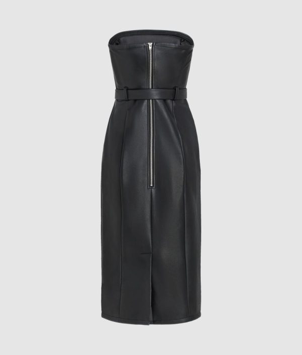 Edgy, sleek, and ready to make a statement. This faux-leather dress is crafted in a bandeau silhouette and features a shiny silver zip at the back and bold waistbelt.