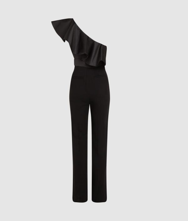 This jumpsuit is a party-season must-have with high-impact appeal. A dramatic oversized ruffle sweeps across the single shoulder for sculptural appeal, while the pleated, tailored pants add a sharp, refined finish.