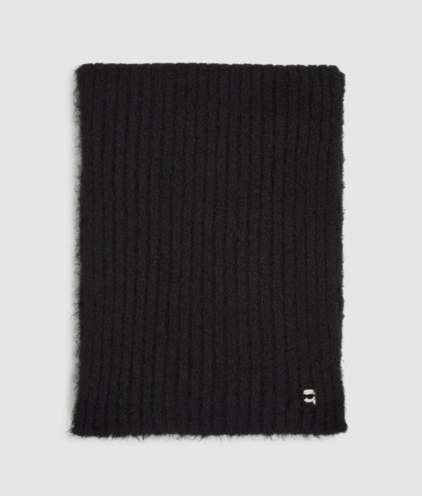 Add effortless style and warmth to winter days with this knitted scarf featuring a cozy rib texture and a polished Ikon Karl metal pin.