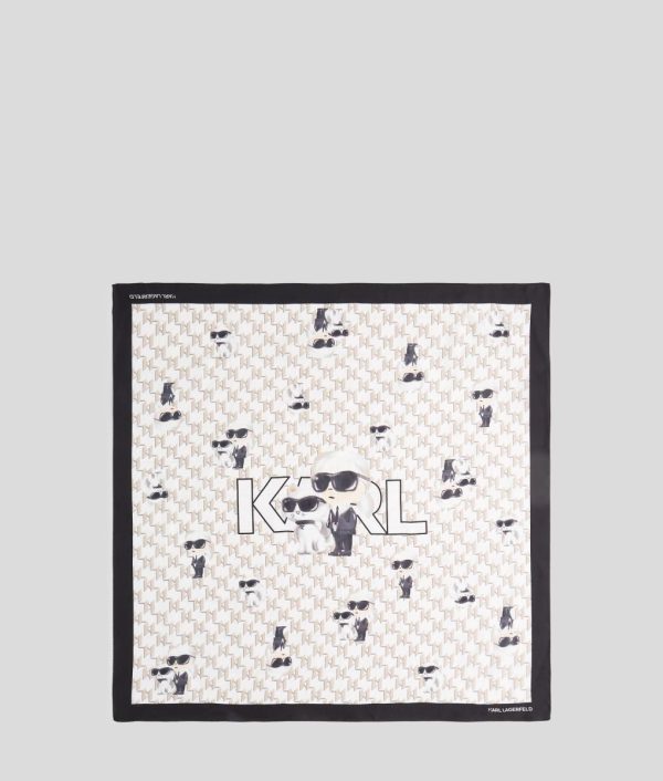 An elegant square silhouette in luxurious silk, this scarf showcases a playful all-over print featuring Ikon Karl and Choupette. Framed by a contrasting border featuring the KARL LAGERFELD logo, it adds a chic touch to any ensemble.