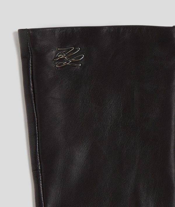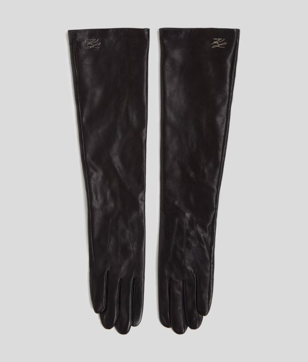 Add an extra touch of luxury to your ensemble with these long-length gloves crafted from soft, supple leather. The full-finger silhouette ensures warmth, complemented by a sophisticated KARL Autograph embellishment.