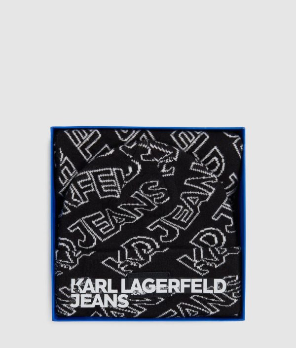 Add individuality to outdoor wear with this gift set, featuring a long-length scarf and folded brim beanie with a bold, all-over KARL LAGERFELD JEANS logo design. Perfectly presented in a signature box.