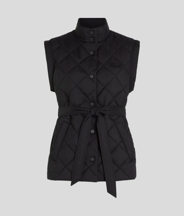 Effortlessly merge style and comfort with this lightweight quilted gilet. The sleeveless design features a high funnel neck and branded press studs, while a self-tie belt allows for a customizable silhouette.