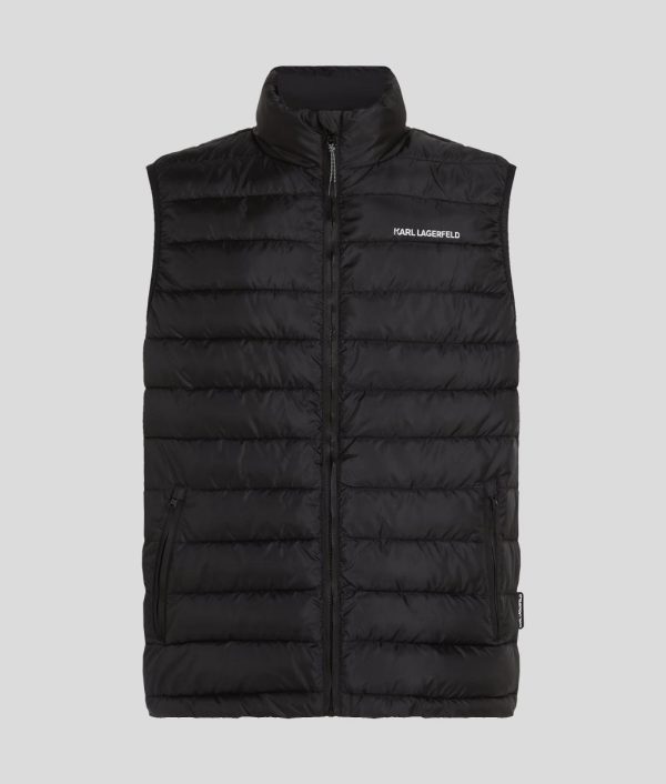 This quilted KARL LAGERFELD gilet combines style with practicality. Its lightweight fabric offers sophisticated comfort, while the stand-up collar adds a poised touch. For modern utility, zipped pockets ensure essentials are secure and at hand.