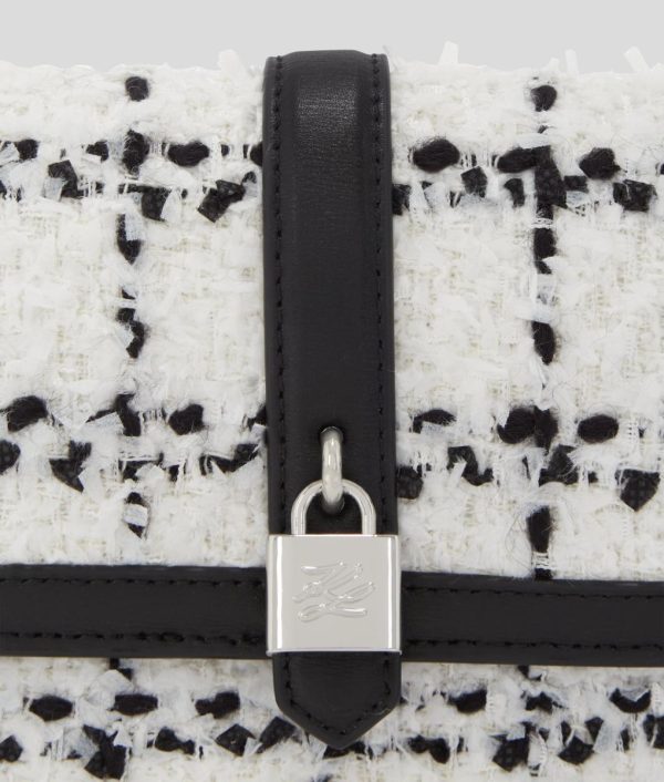 Sophisticated bouclé fabric creates this chic shoulder bag that merges runway-inspired design with everyday practicality. The secure magnetic flap closure and customizable strap deliver perfect comfort, while a signature padlock featuring the Karl Autograph provides a distinctive designer touch. Discreet KARL LAGERFELD branding at the back maintains an elevated aesthetic.