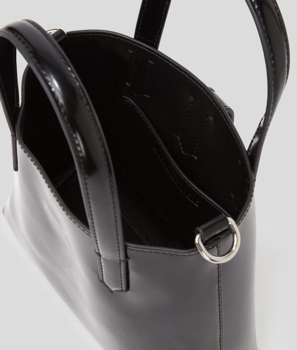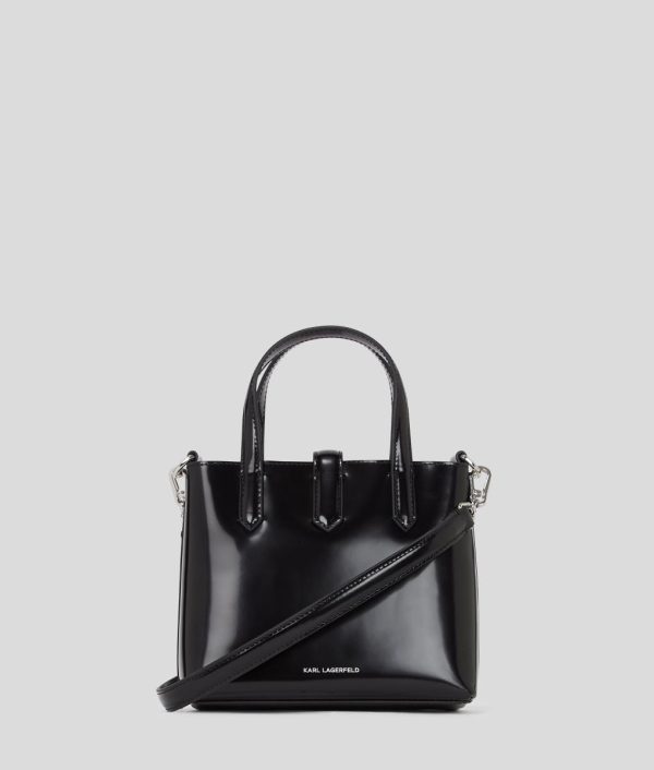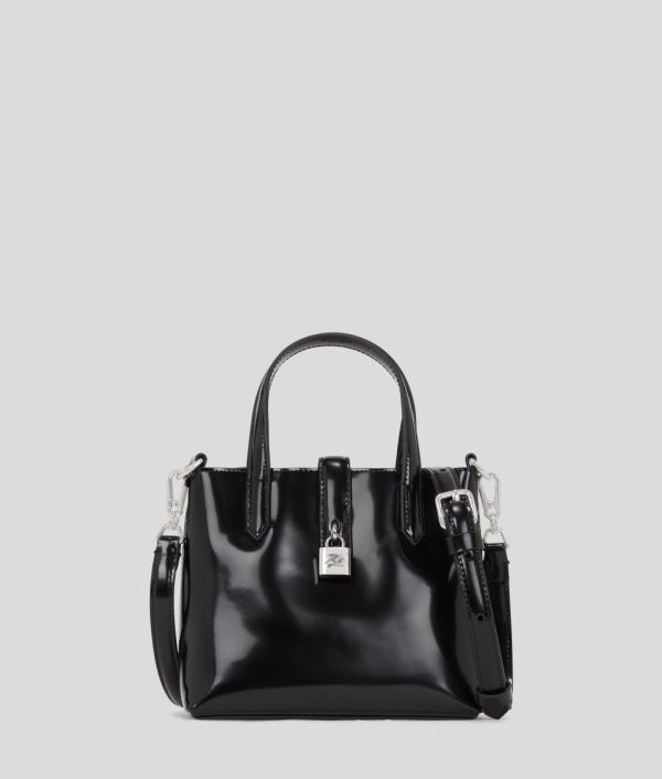 Experience luxury redefined with this sophisticated mini tote crafted from premium glossy leather. The secure magnetic closure keeps your essentials protected while dual top handles and an adjustable crossbody strap provide versatile carrying options. The signature Karl Autograph padlock adds a distinctive designer touch that elevates your everyday style.