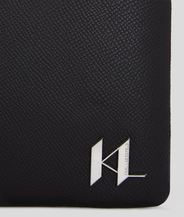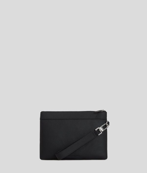 This sophisticated leather pouch combines sleek functionality with iconic designer style, featuring a secure zip-top closure and versatile detachable wrist strap for effortless mobility. The practical front pocket adds organized convenience, while the distinctive Karl Monogram delivers unmistakable luxury appeal.