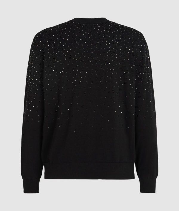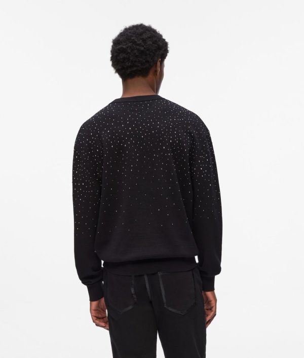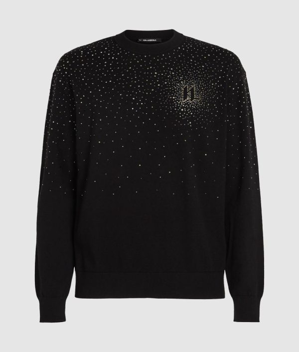 Discover playful elegance with this unique sweater that reinterprets classic knitwear. Adorned with sparkling rhinestones cascading from the collar, it forms the iconic KL Monogram, adding a touch of glamor.