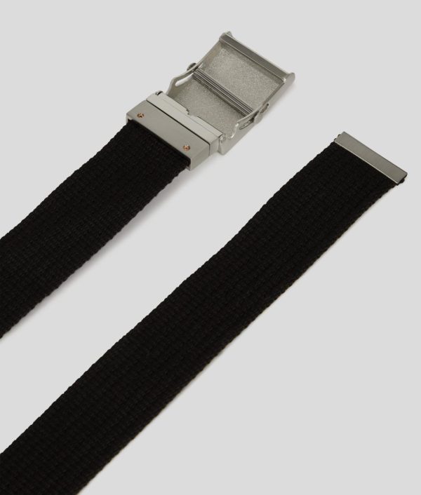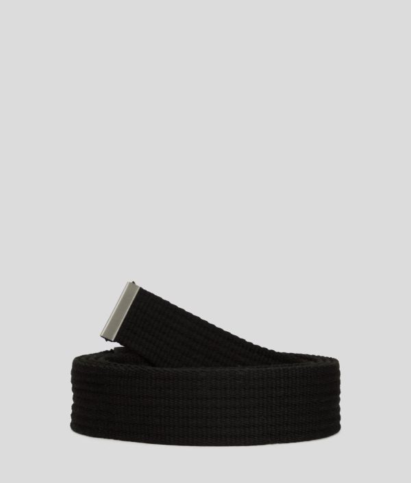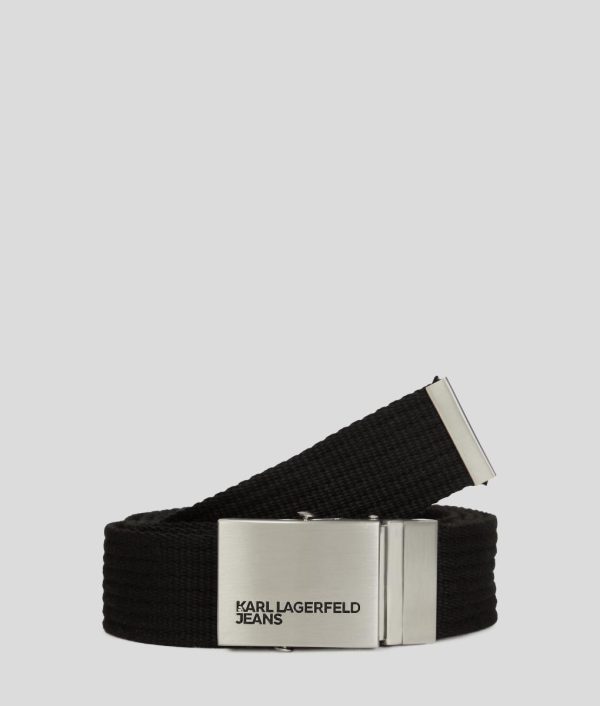 Elevate your everyday style with this standout webbing belt featuring a distinctive textured pattern and bold metal plaque closure, showcasing the iconic engraved KARL LAGERFELD JEANS signature.