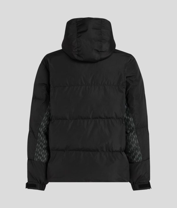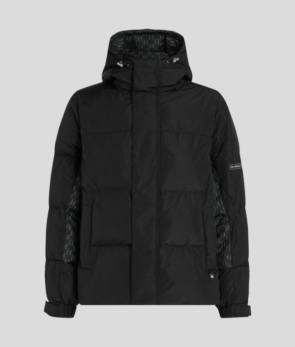Make a powerful style statement with this premium puffer jacket, featuring a streamlined concealed front closure and adjustable drawcords with signature branded stoppers. Strategically placed Karl Monogram paneling reinforces high-movement areas including the inner arms and hood for exceptional durability, while a distinctive logo patch at the sleeve completes this standout outerwear piece.