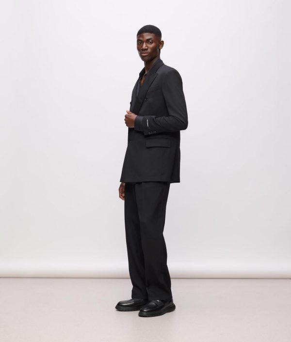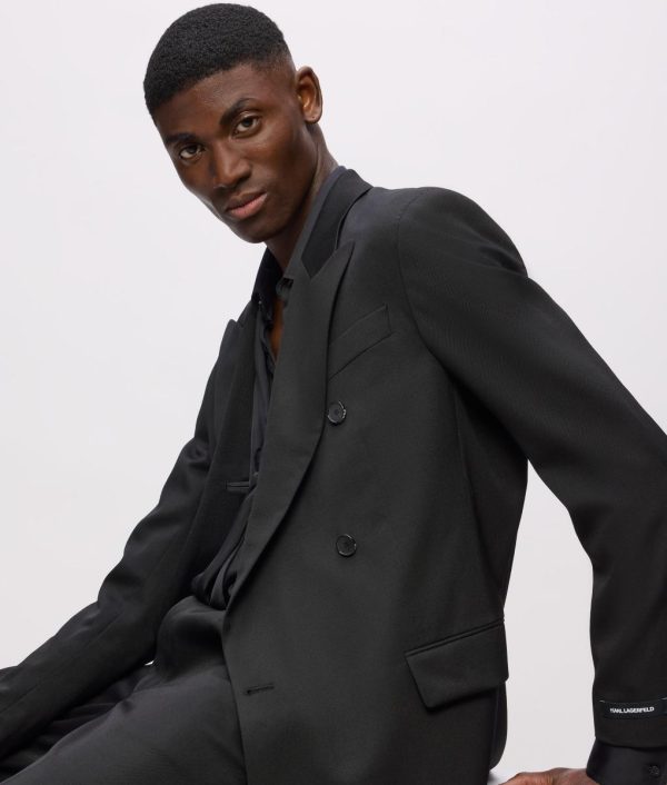 - Bold peaked lapels with structured shoulder construction