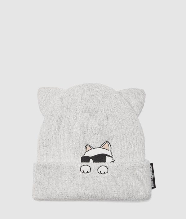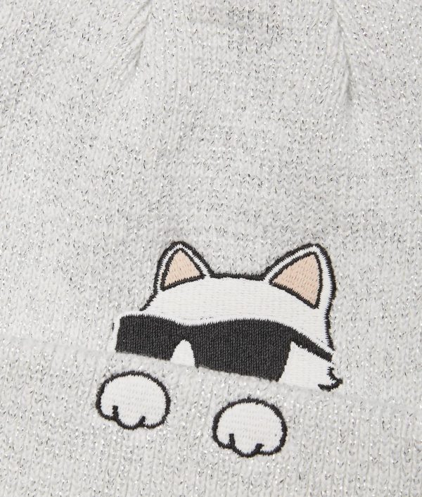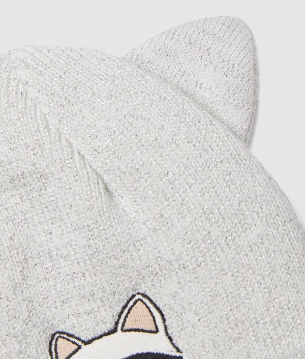Petite in size but overflowing with charm. This ultra-soft knitted beanie features shimmering metallic yarn and adorable 3D cat ears. The folded brim reveals a peek of the iconic Choupette artwork, adding a delightful finishing touch to this whimsical design.