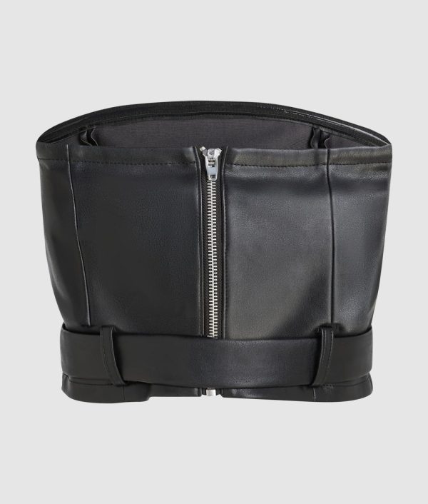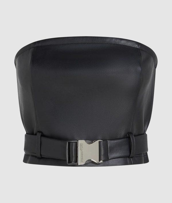 Adorned with silver hardware and a bold waistbelt, this faux-leather bandeau top unites edgy attitude with sleek minimalism.