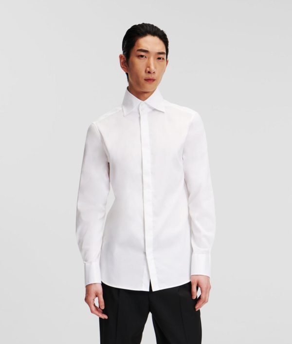Timeless tailoring meets statement detailing in the quintessential KARL LAGERFELD shirt, featuring a hidden button placket, statement high-stand collar, and exaggerated sleeve cuffs. An indispensable wardrobe classic, masterfully tailored from organic cotton poplin.
