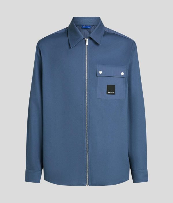 A fresh take on casual style, this lightweight, mixed-material overshirt features a unique quilted finish on the back. The zip front leads to a pointed collar, while a chest pocket embellished with a KARL LAGERFELD JEANS logo patch completes the look. Perfect for wearing on its own or styling over tops for those between-the-seasons days.