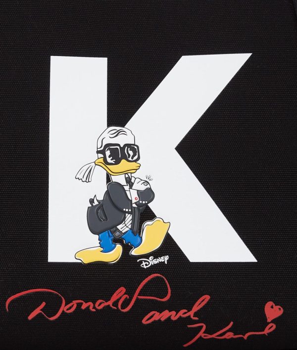 - A special-edition piece from the capsule collection, featuring artwork reimagining Disney’s Donald Duck in Karl Lagerfeld’s unmistakable image