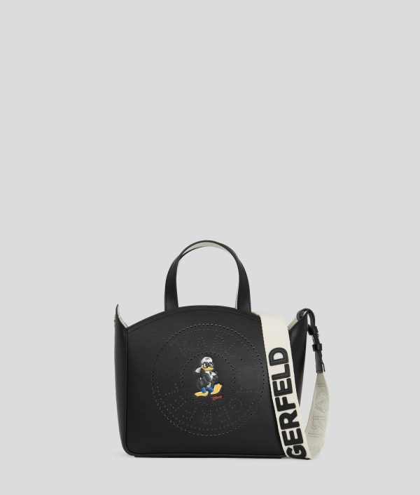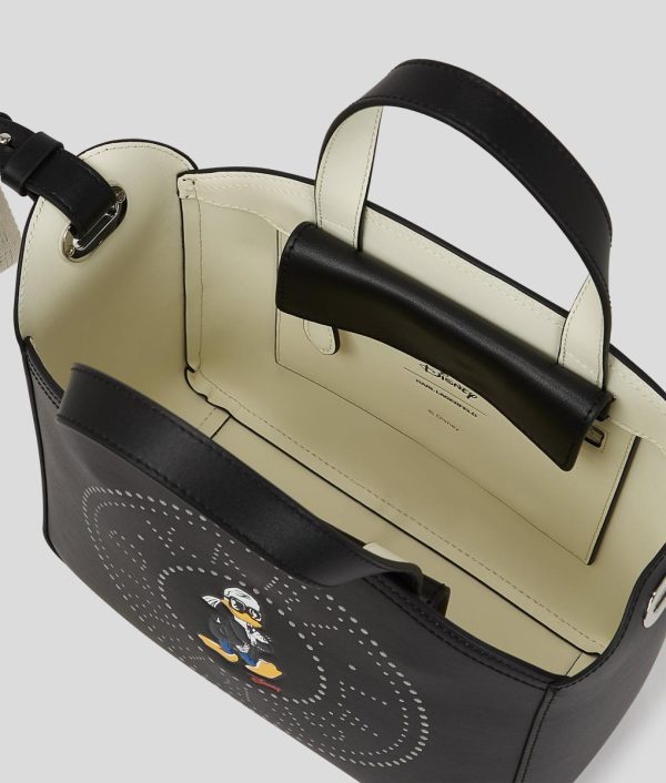 This petite yet practical tote bag blends Karl Circle artwork and a playful sketch of Disney’s Donald Duck to create a unique accessory. Part of a special collection, it features a secure magnetic closure, twin top handles and a statement crossbody webbing strap, this versatile piece offers distinct style and functionality.