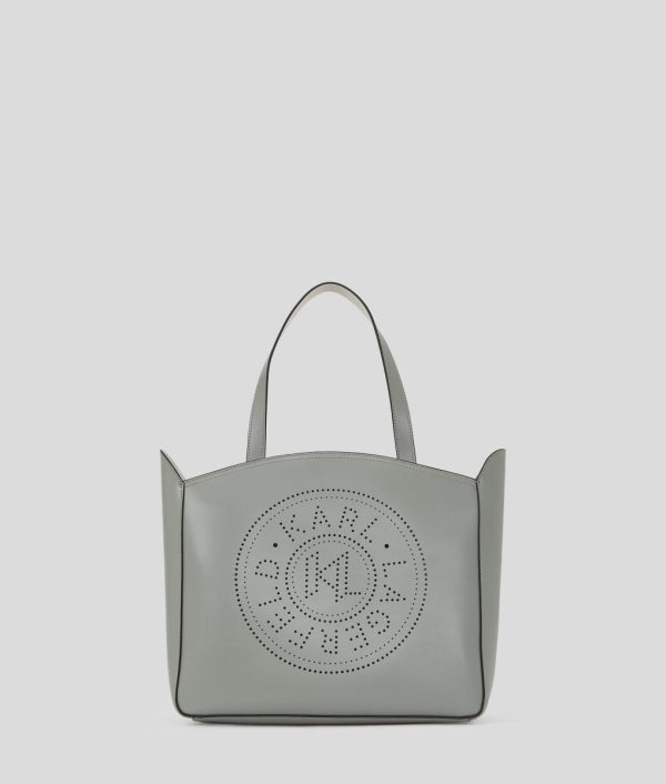 Elevate your everyday style with this elegant tote bag, featuring a spacious silhouette crafted from luxurious leather. A secure zip closure safeguards your essentials, while twin top handles offer effortless carrying. The striking perforated Karl Circle artwork adds a distinctive touch.
