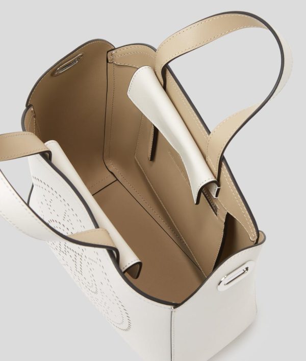 Impeccably crafted from luxurious leather, this K/Circle tote bag enchants with perforated artwork and a refined magnetic closure. Elegance meets function with twin handles and a detachable webbing strap.