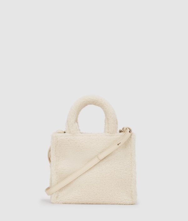 This compact tote bag features a cozy faux-shearling finish, perfect for winter accessorizing.