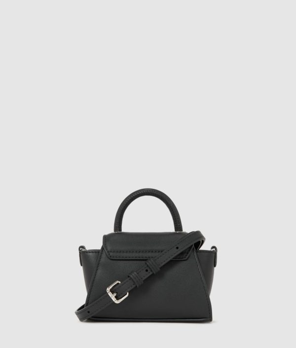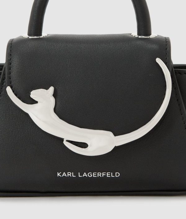 Crafted from smooth leather, this petite top handle bag features elegant hardware honoring Karl Lagerfeld’s beloved Choupette. A detachable crossbody strap offers versatility, while subtle branding completes the refined piece.
