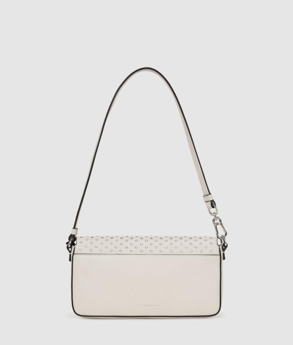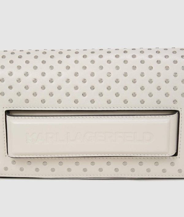 This versatile Ikon K bag can be worn off-the-shoulder or styled as a clutch. The secure flap closure features a discreet hand slot behind a tonal KARL LAGERFELD logo, while the studded embellishments add a rock-chic edge.