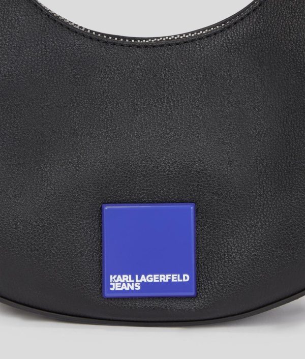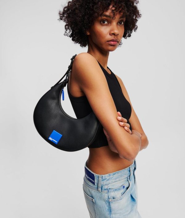 The half-moon shoulder bag showcases a sleek silhouette that comfortably Practical accessorizing with impact. Made to sit snug under the arm, this half-moon shoulder bag features a KARL LAGERFELD JEANS-branded webbing strap and metal box logo for playful attitude.