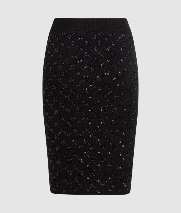 A classic silhouette, reimagined for the spotlight. This sleek, midi-length pencil skirt is embellished in dazzling sequins for glamour, texture, and impact. It’s your go-to piece for elevated evening elegance this party season.