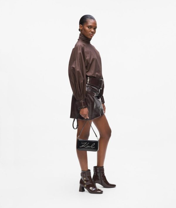 A small pouch with studded Signature artwork, featuring a secure zip closure and a versatile, detachable strap for personalized style. Perfect for everyday essentials.