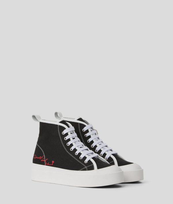 Unveiling limited-edition high-top sneakers from the exclusive Disney capsule collection, showcasing a unique charm of Donald Duck inspired by an archival sketch from Karl Lagerfeld. With a lace-up design and playful collaboration embroidery, they blend nostalgia with a playful flair.