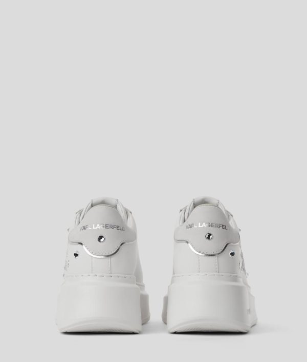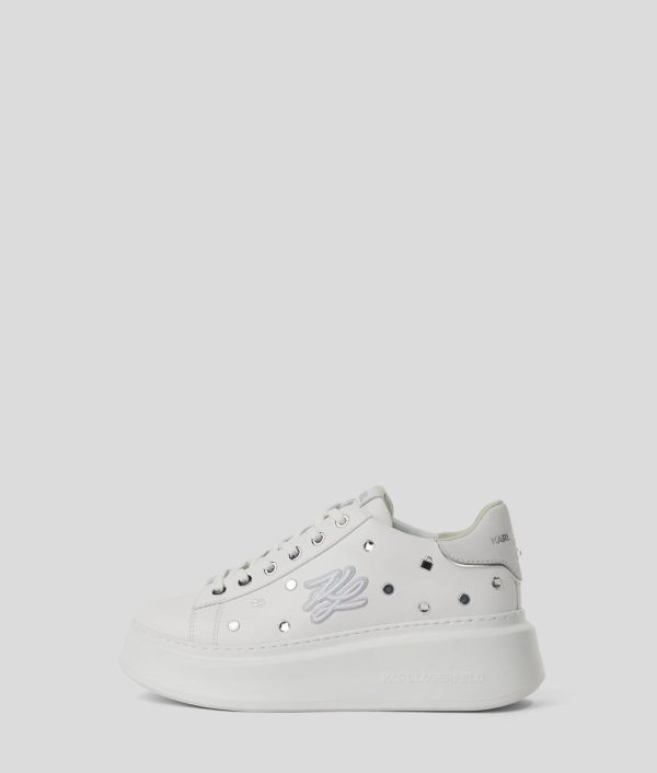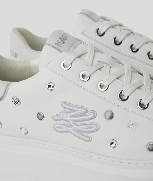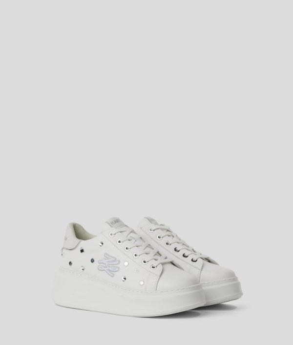 Elevate your footwear with these standout lace-up sneakers featuring striking stud and gemstone embellishments. The playful design is complemented by iconic Karl Autograph artwork, while a contemporary high wedge sole and tonal heel counter displaying the KARL LAGERFELD logo complete the confident look.