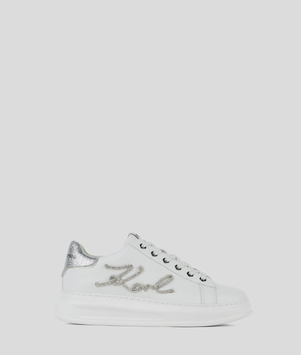 A playful twist on classic style, these sneakers feature glittering laces and a shimmering heel counter adorned with the KARL LAGERFELD logo. The crystal-embellished KARL Signature artwork further enhances their appeal, while the soft textile lining ensures all-day comfort.