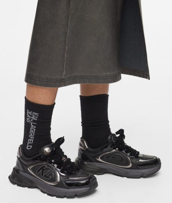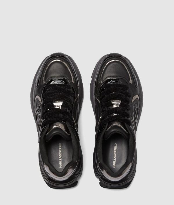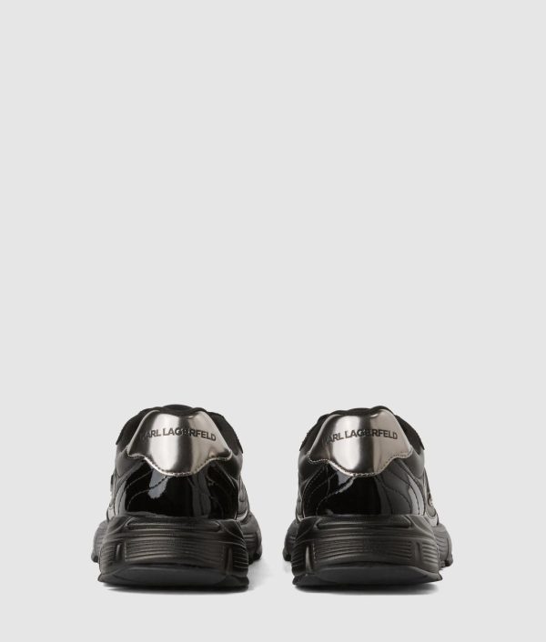 Perfect for those who dare to make a statement, these sporty sneakers boast a leather design with patent and metallic accents. A contrasting pattern at the sole and a bold rubber KL-logo enhances their standout appeal.