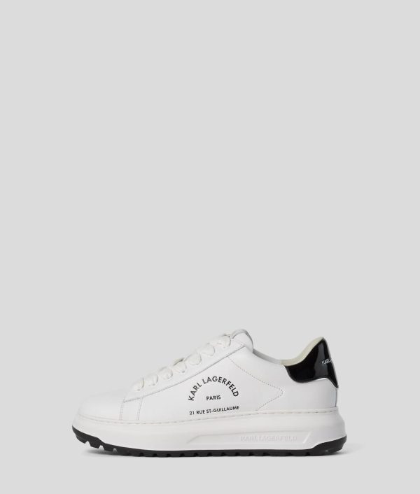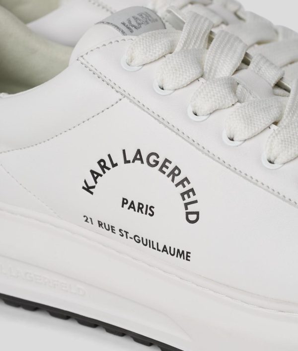 Elevate your style effortlessly with these luxurious KARL LAGERFELD sneakers, embellished with the iconic Rue St-Guillaume logo. Crafted from premium leather, these sneakers feature a sleek lace-up design and a striking contrasting heel counter.