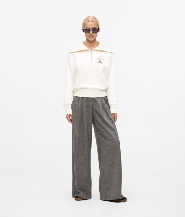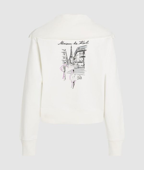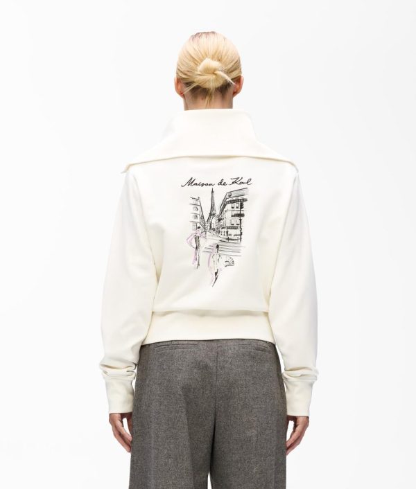 A cozy organic cotton sweatshirt featuring a half-zip collar and subtle ribbing details. Iconic Paris sketches bring a touch of city chic to this casual staple.