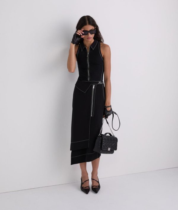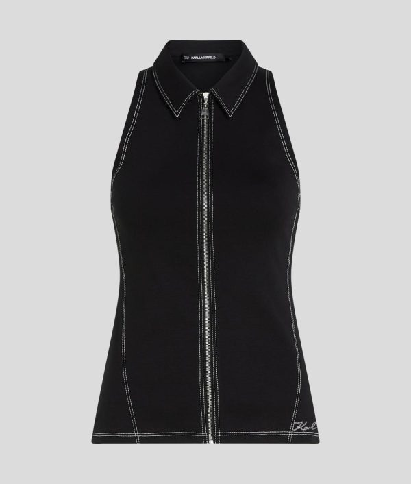 A preppy twist on classic style, this sleeveless top features a polo-inspired collar and a bold zip closure. Contrasting stitching adds a playful touch and ensures this piece pairs effortlessly with the matching wide-leg pants or midi skirt.