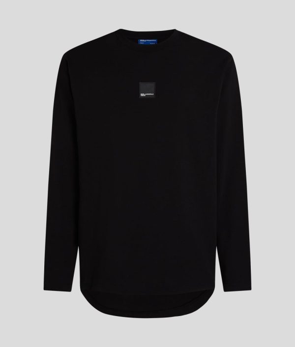 A modern twist on a wardrobe classic, this long-sleeved t-shirt features a ribbed crew neck and a contemporary curved hem. The KARL LAGERFELD JEANS box logo adds a bold touch, perfect for casual-cool styling.